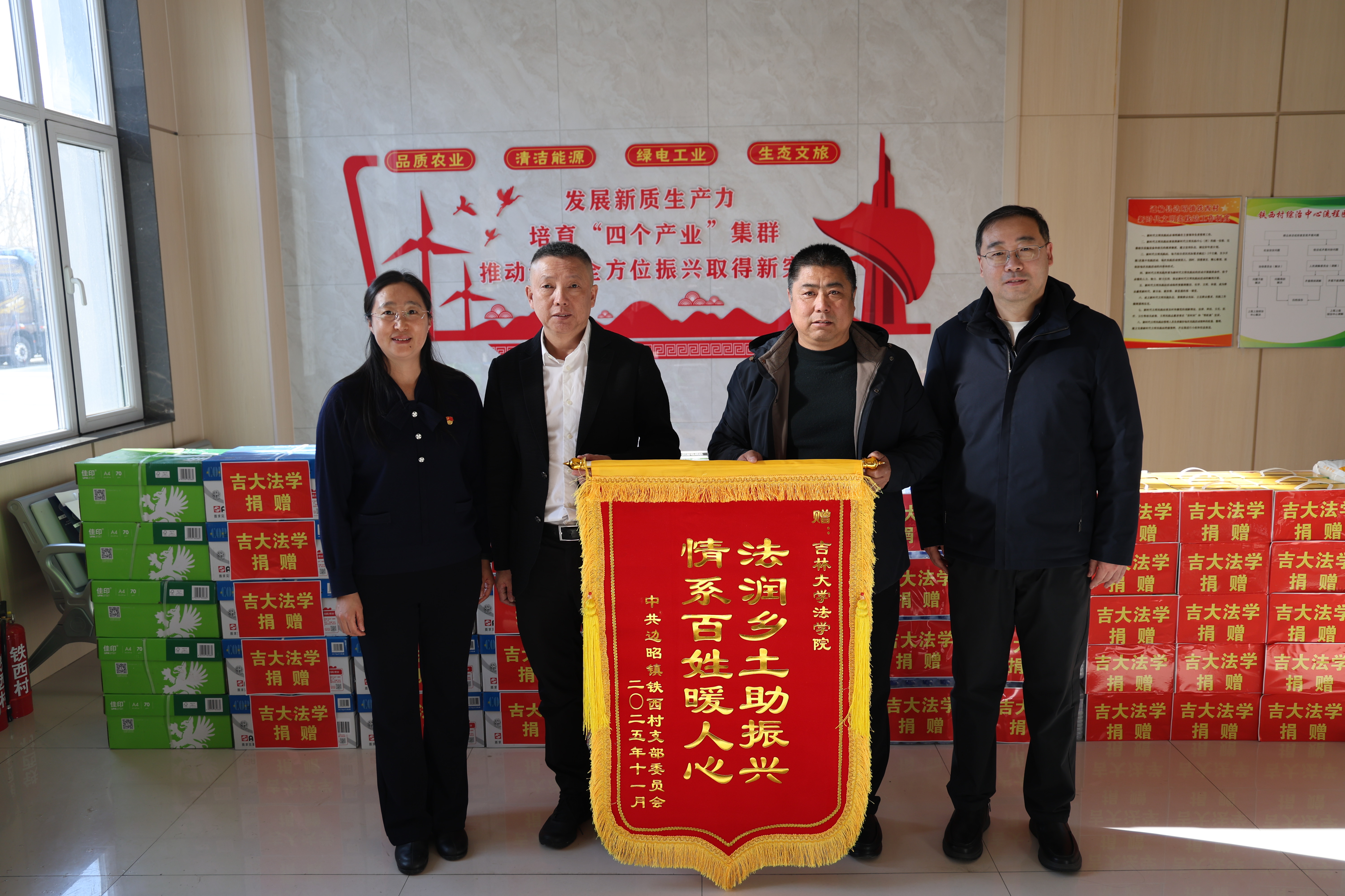 向铁西村捐赠物资,铁西村则回赠锦旗,体现了深厚的校地情谊。随后,张俊峰副书记为村民讲授专题党课,强化党建引领。由学生自编自演的“普法小剧场”生动演绎了赡养纠纷案例,实现了“以案释法”的良好效果。师生们还参观了村办制衣厂,并入户慰问老乡,传递关怀。