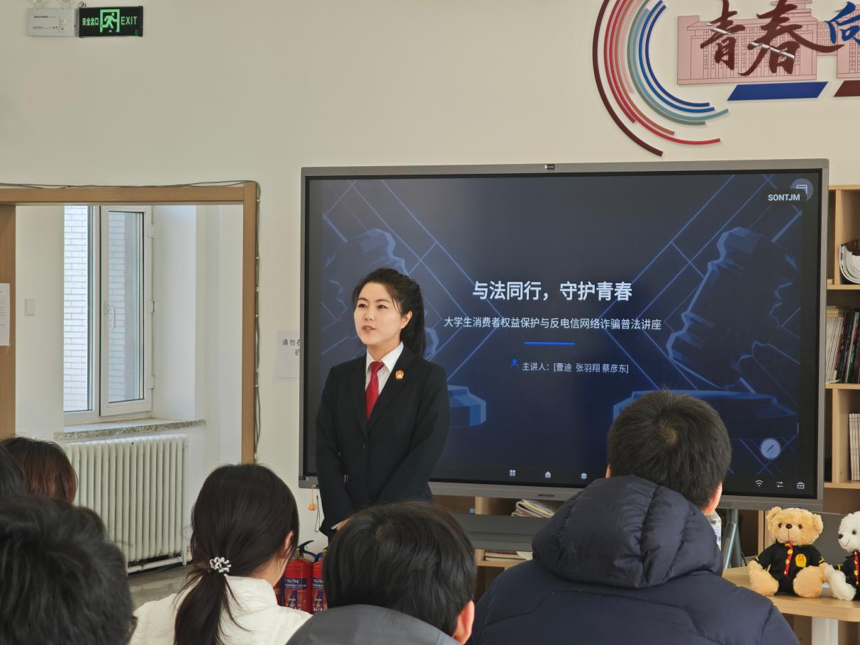 在南岭社区,长春市南关区人民法院执行指挥中心负责人曹迪,带领执行干警蔡彦东和张羽翔以“与法同行,守护青春”为主题,聚焦大学生消费权益保护与反电信网络诈骗两大方面,结合相关法律规定与真实案例,剖析了校园生活中常见的消费陷阱和电信网络诈骗手段,为同学们维护自身合法权益、有效识别和防范诈骗提供了实用的法律指南与行动建议。