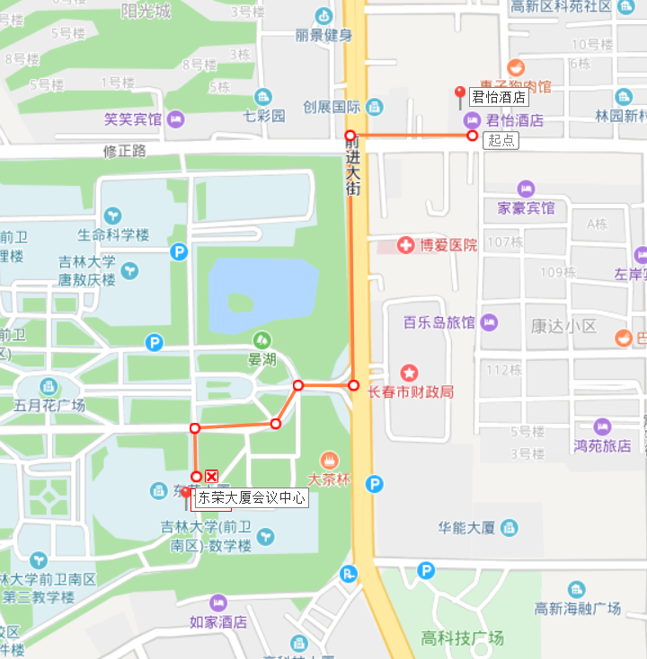 2.本次会议的会议地点暂定为吉林大学前卫南区东荣大厦会议中心,地址:吉林省长春市高新区前进大街2699号。与会代表可选择步行从君怡酒店出发,经吉林大学东门前往东荣大厦会议中心,行程约10分钟。