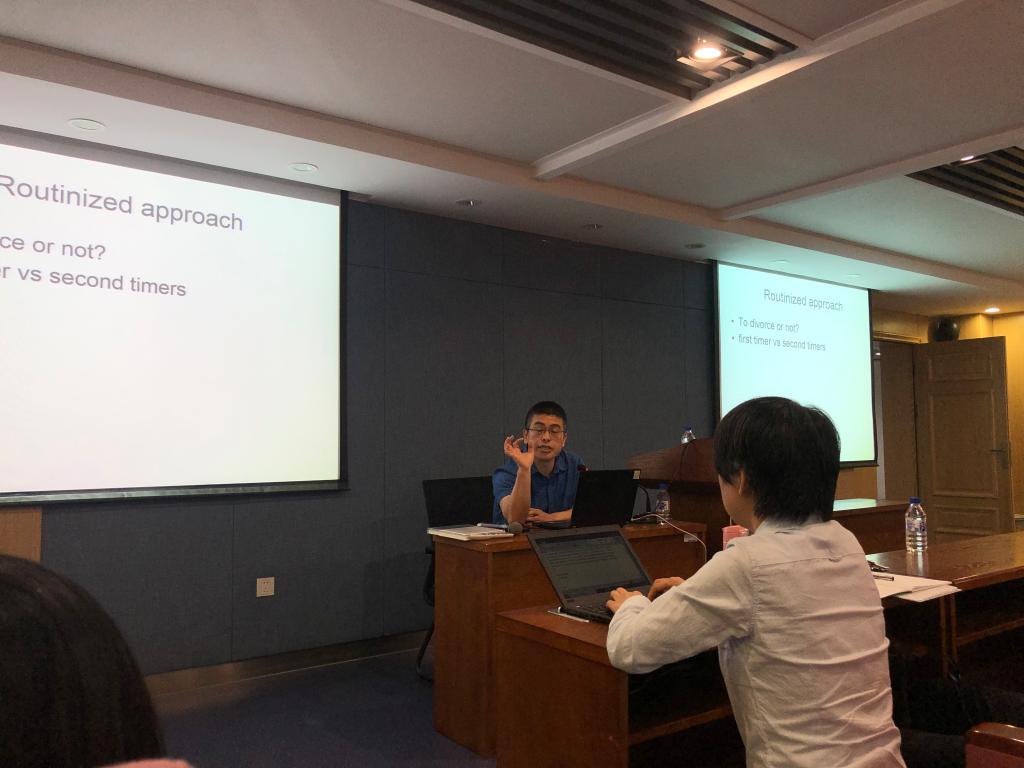 贺欣老师首先提出婚姻不仅是个人的事情,它还直接联系到家庭乃至国家的稳定。无论是在传统社会还是现代社会婚姻都具有重要地位。然而遗憾的是现有的关于性别、婚姻的法社会学研究还是少之又少。本次讲座主题中的“男权化”是从结果主义上讲的,即裁判对女性不利,这体现在是否准予离婚、财产分割、子女抚养权等问题上。虽然现阶段男女平等已经成为普遍共识并以基本原则的形式写入婚姻家庭法,但是为什么还会出现男权化的裁判结果呢?这是贺欣教授问题的切入点。从法条上看,夫妻关系确已破裂是法院衡量是否准予离婚的法定事由,但是现实生活中这一是由是很难确定了标准有及其模糊。经过大量的调研和实证分析,贺欣教授发现在司法事件过程中是否准予离婚主要有两个标准:其一看当事人是第几次来离婚?其二是看使用的程序,简易程序还是普通程序。法官在审理婚姻家事案件时主要的考量的因素主要包括:1.安全的问题:从实践经验中总结,涉及到离婚和家庭纠纷的案件,法官生命安全经常会受到威胁;2.结案的效率,即最大程度上节约司法资源;3.维稳的政治需要。虽然立法是否完善、法官是否会有性别歧视也有可能成为影响离婚诉讼裁判结果的因素,但是无法超越司法的结构性因素而起实质的作用。